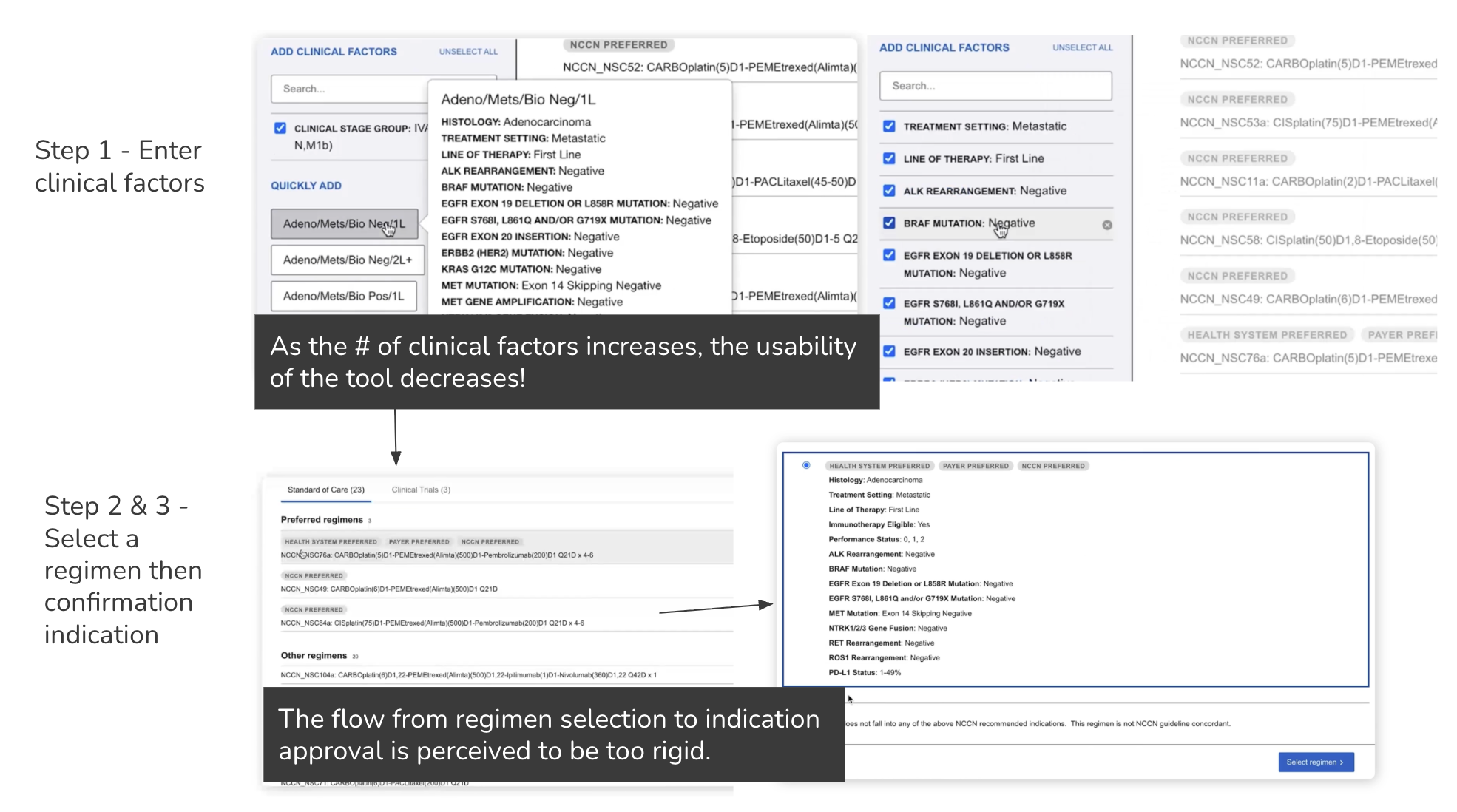 The design principles resonated with so many team members and stakeholders because we all felt our product had gradually lost its user-centricity. We believe no one should ever feel like Assist is forcing them into an action or decision. Flatiron Assist is meant to be used by both novice and experienced clinicians, and even the most experienced providers run into unfamiliar clinical scenarios. Our interface should be learnable and efficient for both types of users. That wasn’t the case before the redesign, experienced doctors found the tool too cumbersome to use. In order to build a more scalable solution, especially in the wake of the content partnership with Dana Farber, I asked my team to re-imagine the information architecture of the application with flexibility and modularity in mind.